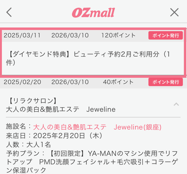 「OZのプレミアム予約」ご来店翌日、「もらえるポイント」には基準の1%分(100円=1ポイント)のポイントのみ付与されます。