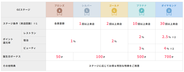 ※ダイヤモンドステージでOZmallオフィシャルカード(夢なびVISAカード)会員の場合は、表示のポイント還元率に加えて、それぞれ1%ずつアップします