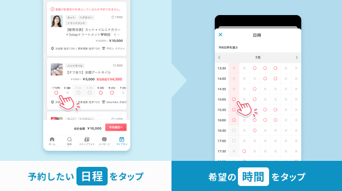 - 一覧画面から日時を選択しただけでは予約完了となりません。必ず「予約確認へ」をタップして予約してください。